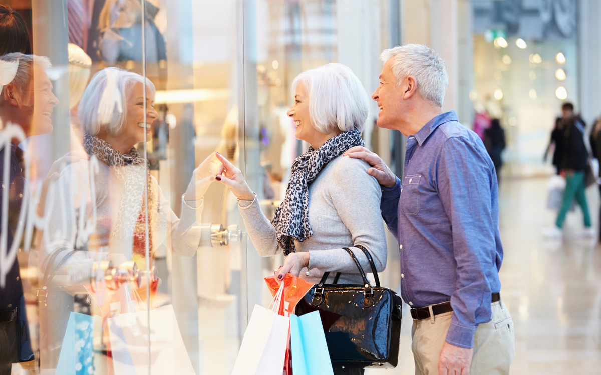 älteres Paar mit Tragetaschen im Einkaufszentrum